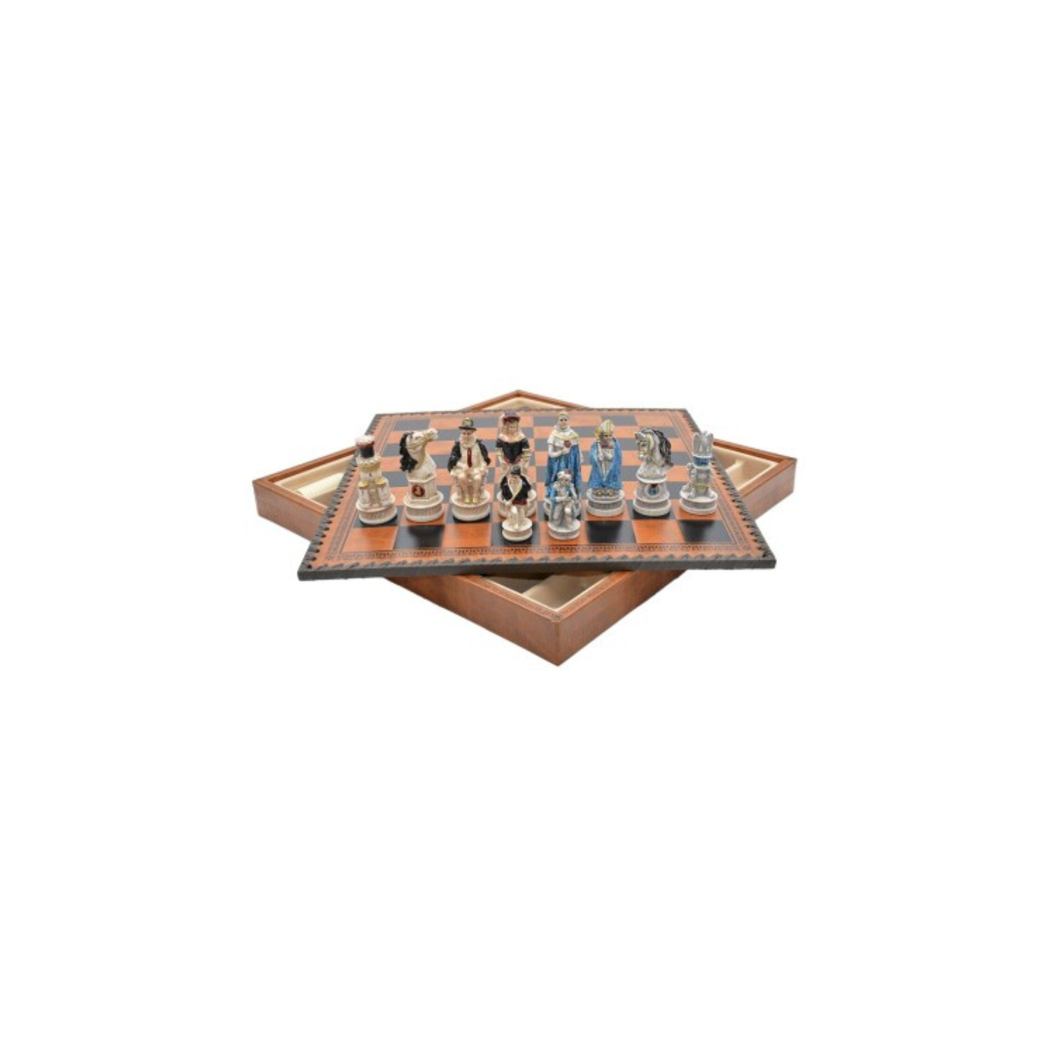 Ajedrez con tablero y fichas de backgammon BATALLA DE ESPAÑA. Recreación de la batalla de España. Fabricado artesanalmente en Italia. Las fichas están coloreadas a mano. El interior tiene compartimentos para guardar las fichas.