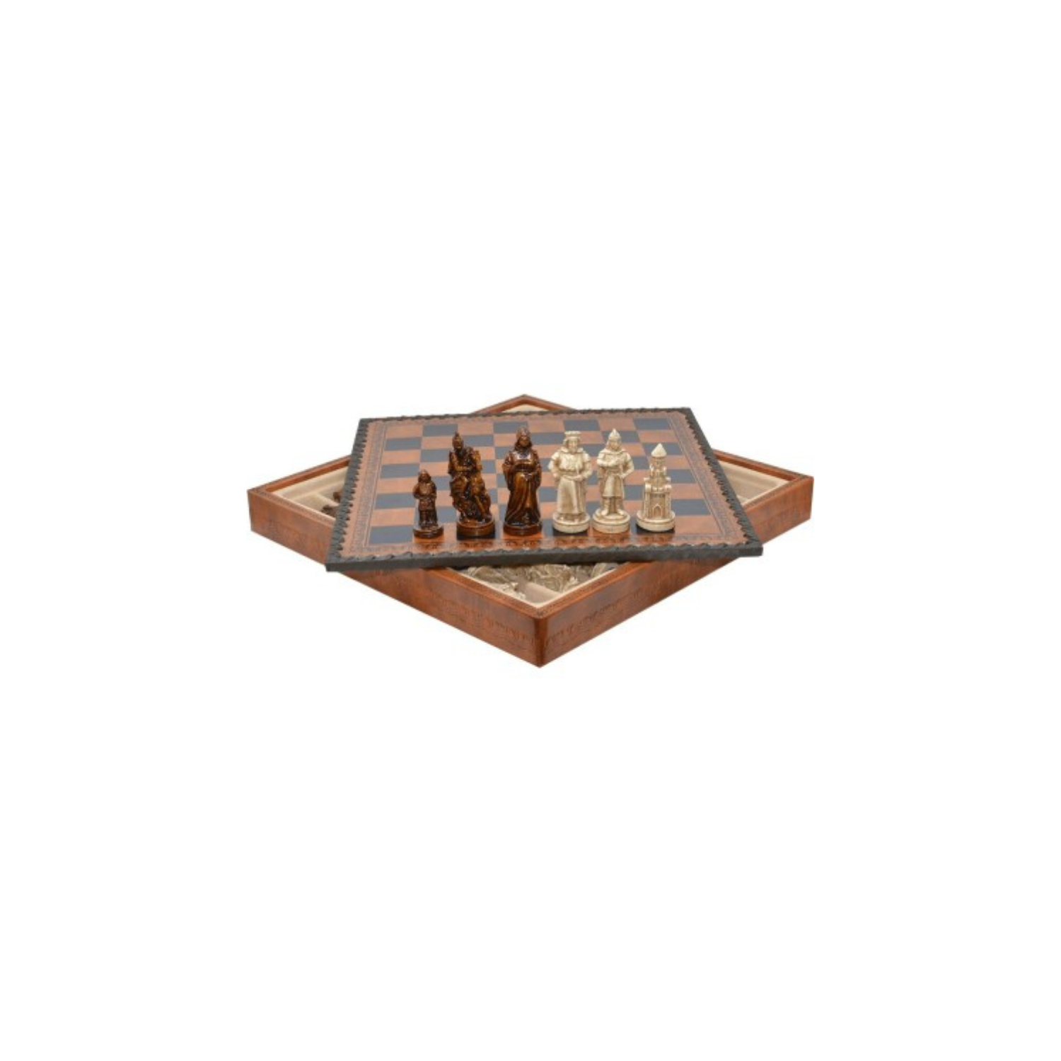 Ajedrez con tablero y fichas de backgammon WATERLOO Recreación de la Batalla de Waterloo 1815, donde las fuerzas británicas comandadas por el duque de Wellington derrotaron al ejército francés al mando de Napoleón Bonaparte. Fabricado artesanalmente en Italia. El interior tiene compartimentos para guardar las fichas.