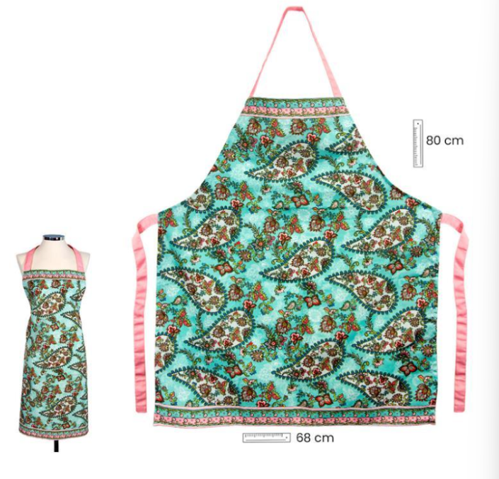 Delantal alta calidad 100% poliéster decorado elementos. Funcional y duradero. Tamaño 80×67 cm lavar a mano o a máquina Max. 30 grados. no usar lejía. no usar secadora.