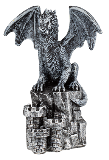 Figura de resina en forma de dragón posado en un castillo.