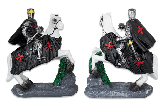 Figura de resina en forma de caballero templario montando a caballo con maza.