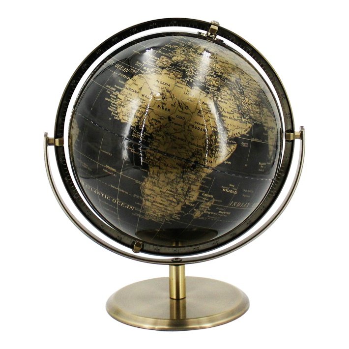 GLOBO TERRAQUEO EN PVC Y METAL. EN NEGRO-DORADO. 23 CM. COD: 33653