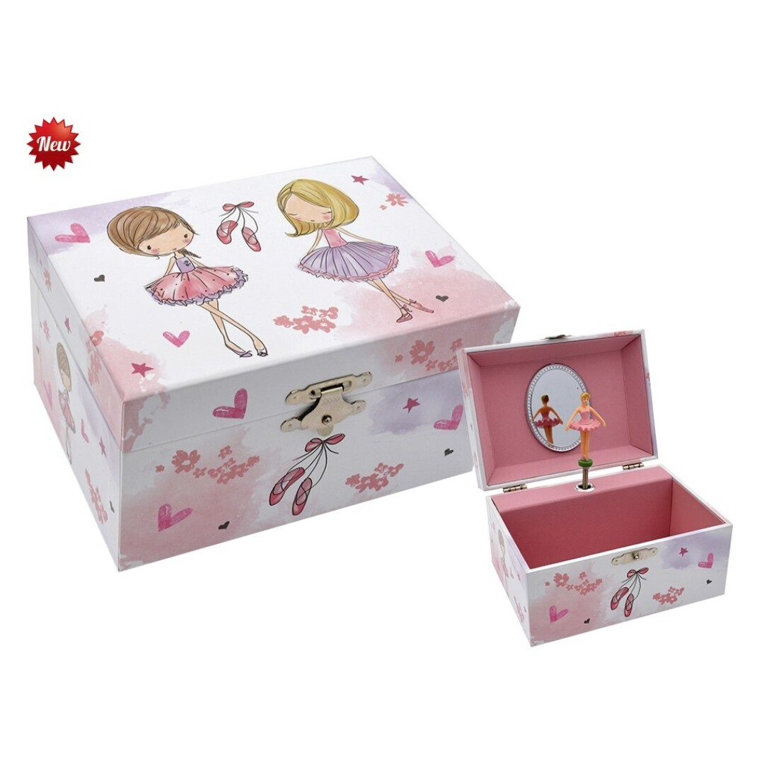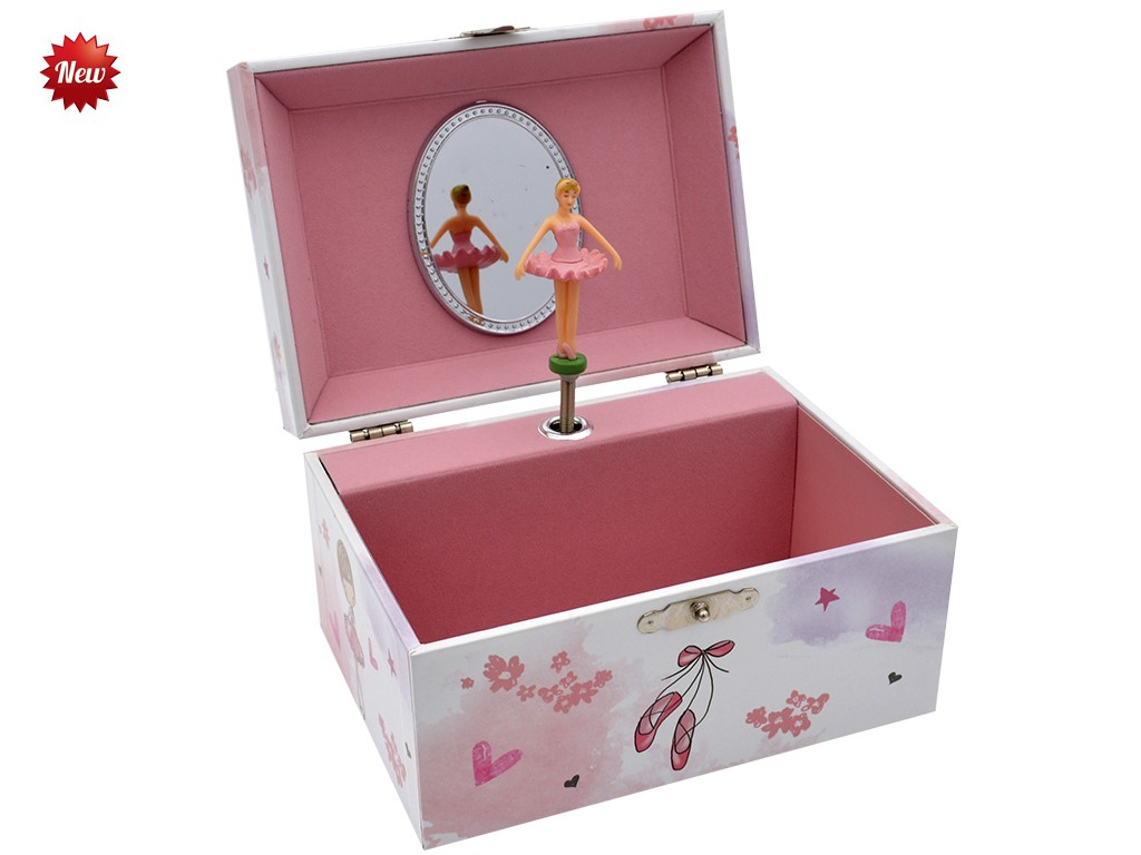 Joyero musical y bailarina. Cuando abres la caja gira la bailarina y suena la música. Forma rectangular. Diseño de bailarina bailando, zapatillas y flores.