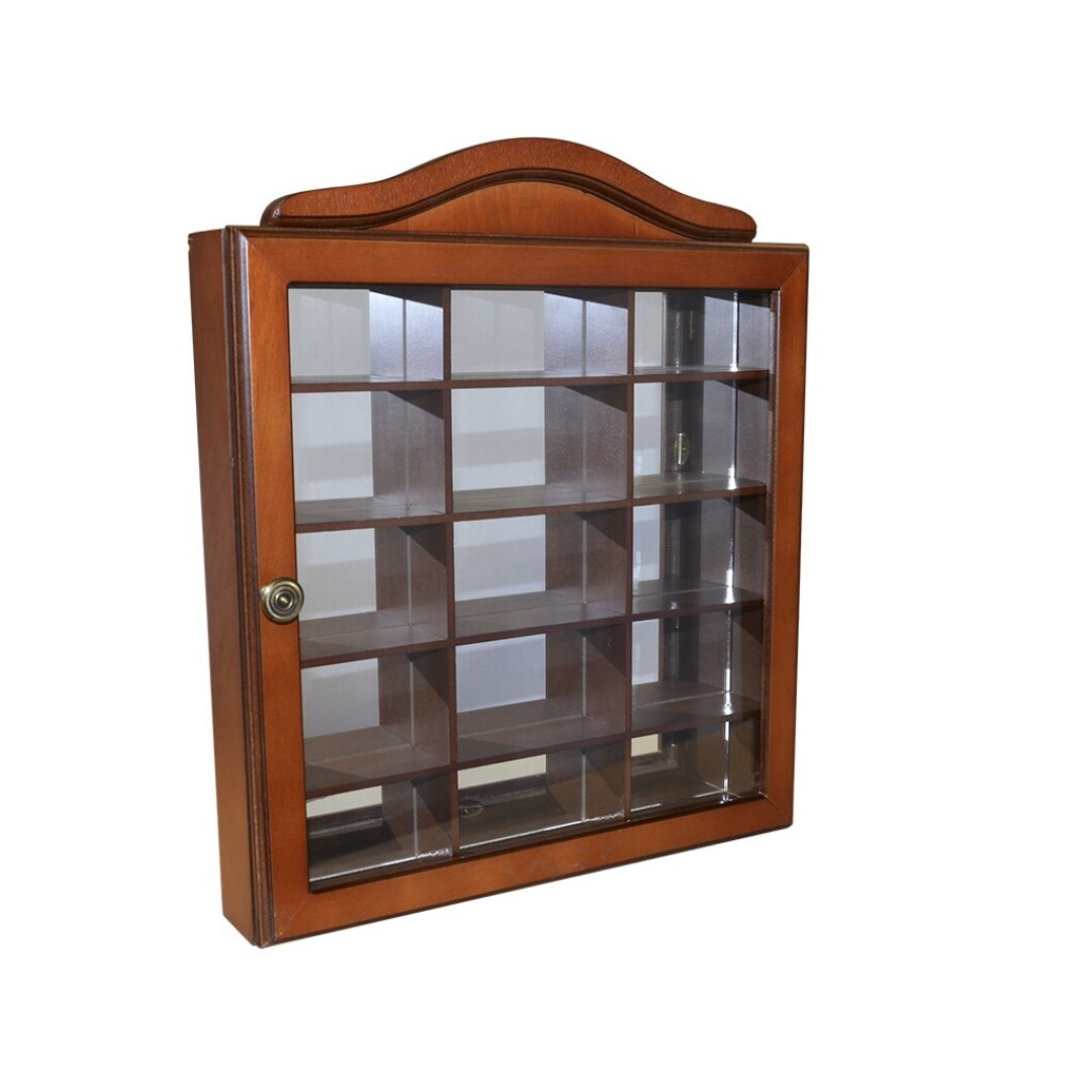 Vitrina de madera color nogal con puerta y espejo en el fondo. Lleva 2 ganchos en la parte posterior para poder colgarla, y un cierre magnético. Tiene 15 compartimentos para poner miniaturas, cada compartimento mide 11×6,5 cm. Ideal para coleccionistas.