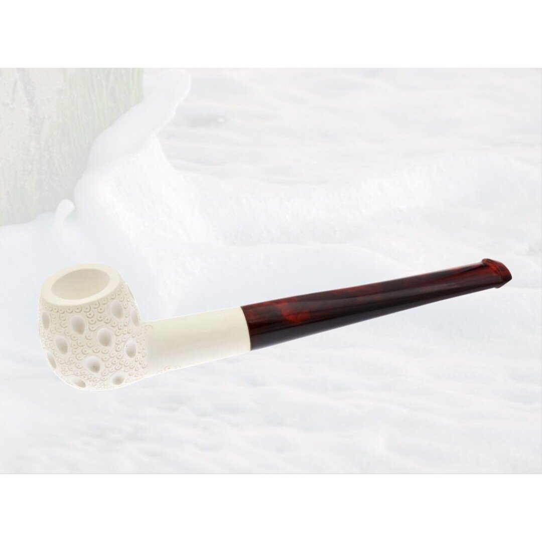 Pipa de espuma de mar Apple tallada. Están fabricadas en bloque de espuma de mar de primera calidad, y cada una de ellas esta tallada artesanalmente a mano por Hilmi Cay, maestro artesano de nueva generación, pero siguiendo cuidadosamente la tradición de su abuelo Nejdet y su padre Nevzat, fundadores de la empresa en 1972. Él ha nacido y vive en Eskisehir, una de las zonas más importantes en Turquía de minas de sepiolita (espuma de mar). Pisadientes acrílico coloreado color ámbar, ajustado con rosca, sin filtro. Estuche de madera de color negro, ajustado al tamaño de la pipa.