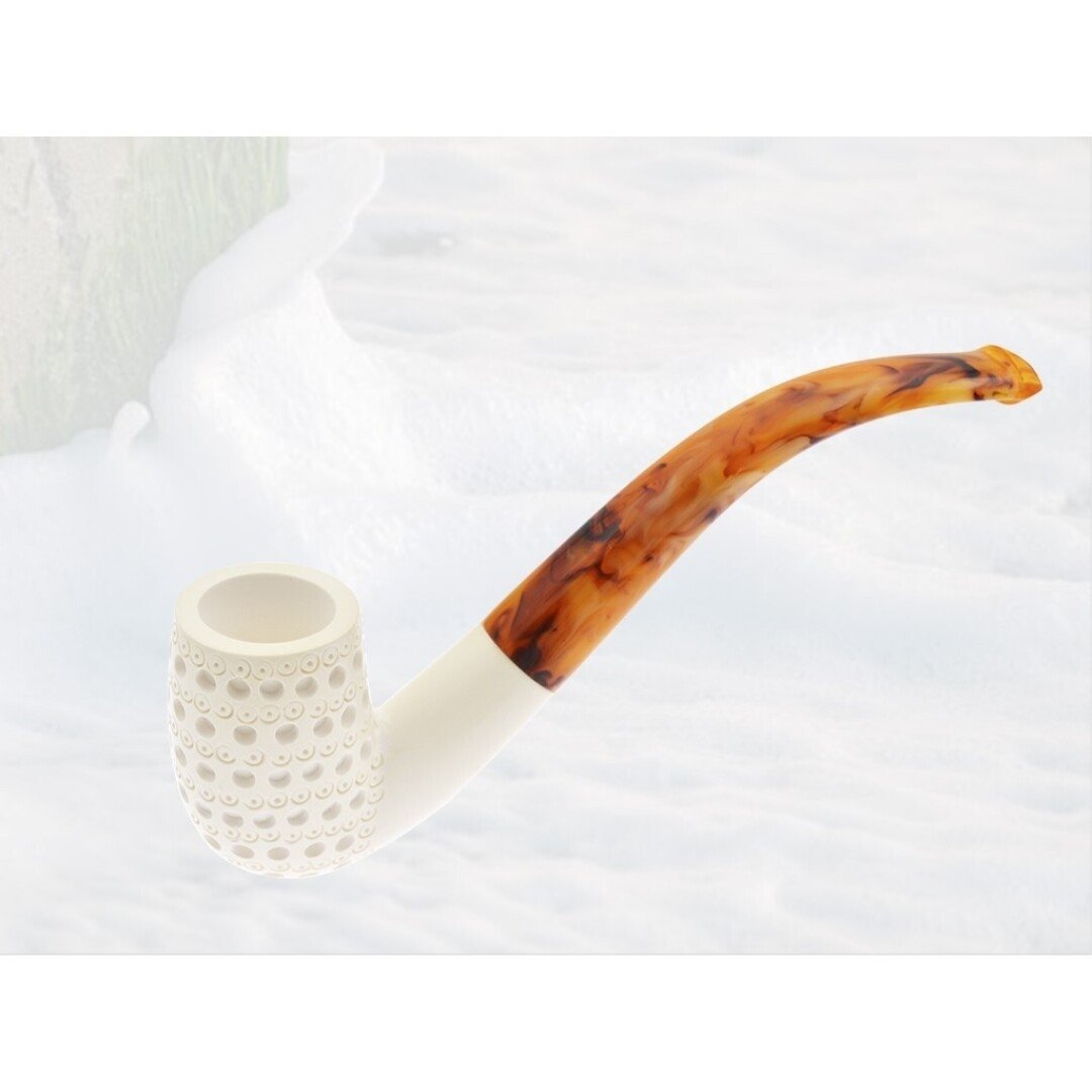 Pipa de espuma de mar Billiard tallada. Están fabricadas en bloque de espuma de mar de primera calidad, y cada una de ellas esta tallada artesanalmente a mano por Hilmi Cay, maestro artesano de nueva generación, pero siguiendo cuidadosamente la tradición de su abuelo Nejdet y su padre Nevzat, fundadores de la empresa en 1972. Él ha nacido y vive en Eskisehir, una de las zonas más importantes en Turquía de minas de sepiolita (espuma de mar). Pisadientes acrílico coloreado color ámbar, ajustado con rosca, sin filtro. Estuche de madera de color negro, ajustado al tamaño de la pipa.