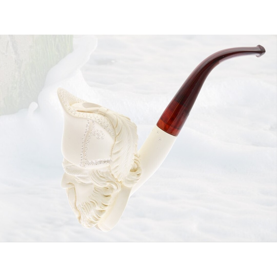 Pipa de espuma de mar cabeza Pirata. Están fabricadas en bloque de espuma de mar de primera calidad, y cada una de ellas está tallada artesanalmente a mano por Hilmi Cay, maestro artesano de nueva generación, pero siguiendo cuidadosamente la tradiciones de su abuelo Nejdet y su padre Nevzat, fundadores de la empresa en 1972. Él ha nacido y vive en Eskisehir, una de las zonas más importantes en Turquía de minas de sepiolita (espuma de mar). Pisadientes acrílico coloreado color ámbar, ajustado con rosca, sin filtro. Estuche de madera de color burdeos, ajustado al tamaño de la pipa.