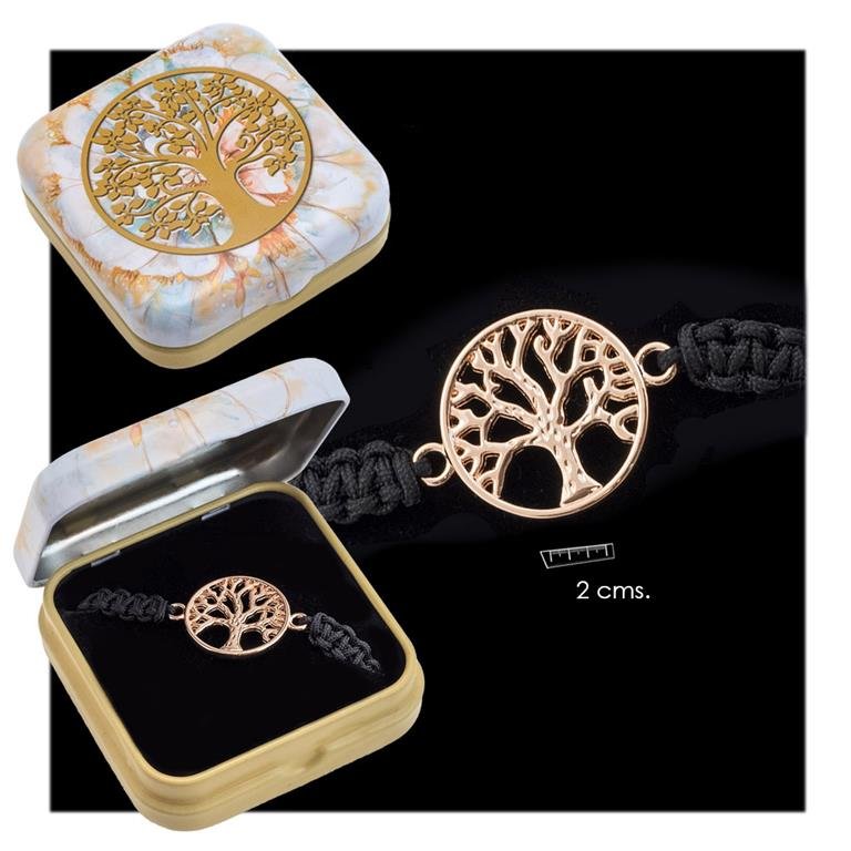 Pulsera árbol de la vida color oro rosa en lata mismo decorado. Tamaño del adorno 2 cms de aleación de zinc. Correa de tejido de hilo negro.