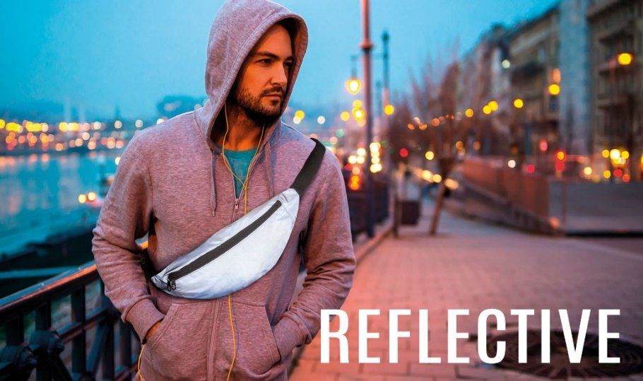 Riñonera realizada en material reflectante, asegurando una máxima visibilidad en condiciones de paca luz y dando a tu imagen de marca un resultado espectacular.