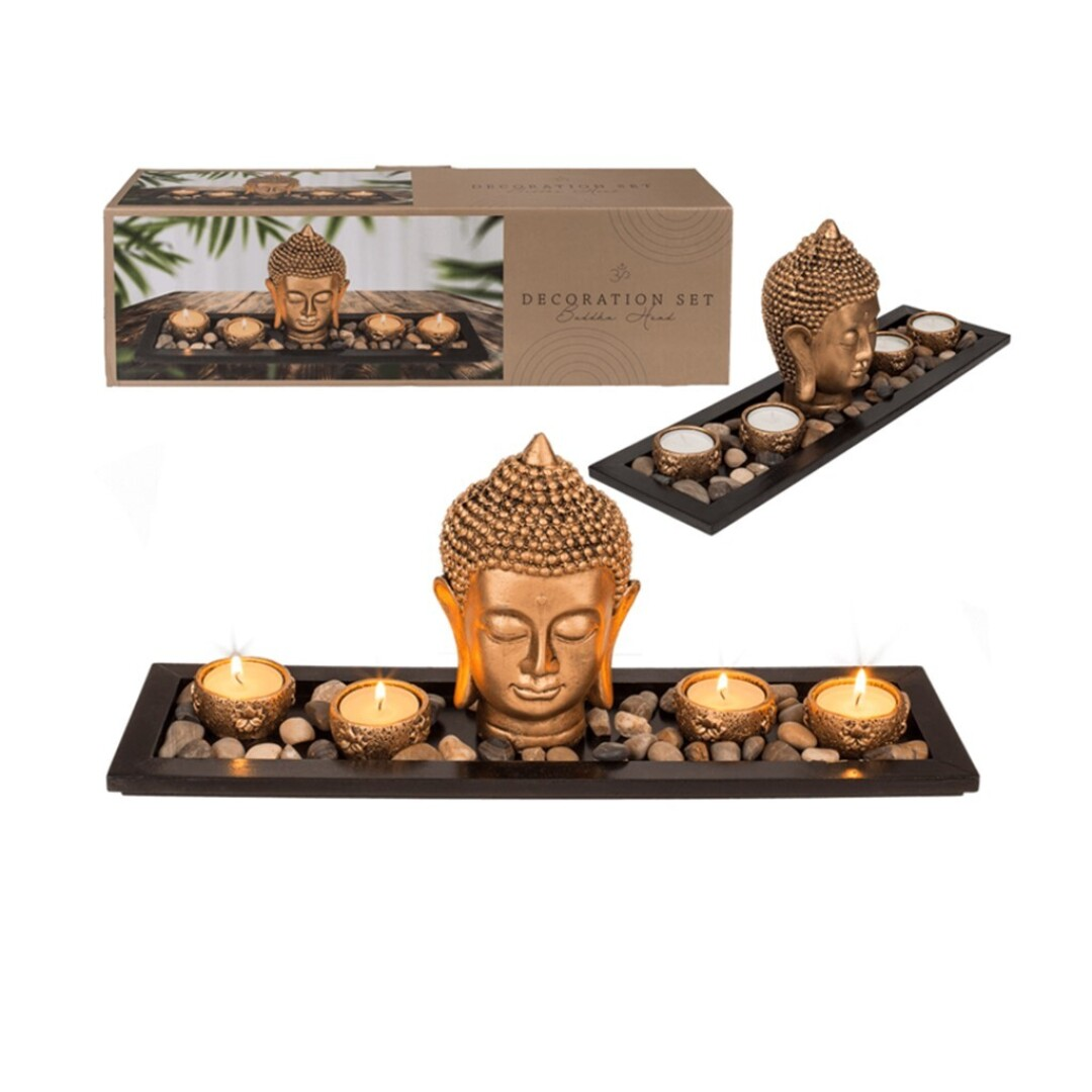 Set decorativo Buda en poliresina. Incluye plato negro rectangular, cabeza de Buda, 4 velas y piedras decorativas. Empaquetado en caja de regalo