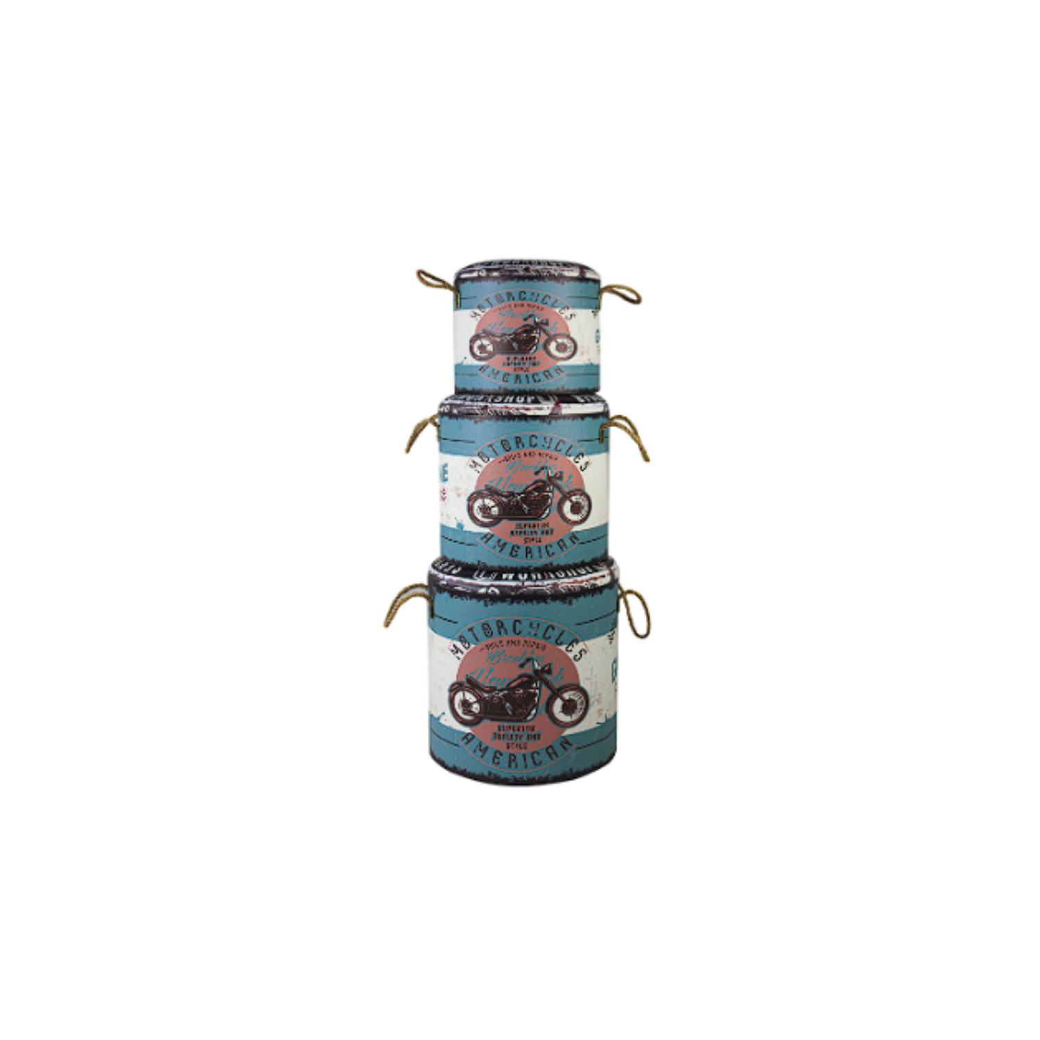 Set de 3 taburetes para almacenaje con diseño de moto.