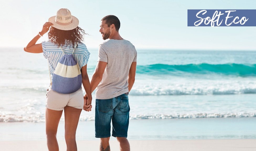 Cómoda bolsa que se convierte en una gran toalla suave y realizada en algodón reciclado y orgánico. Una vez usada, puedes volver a plegarla y utilizarla como bolsa.